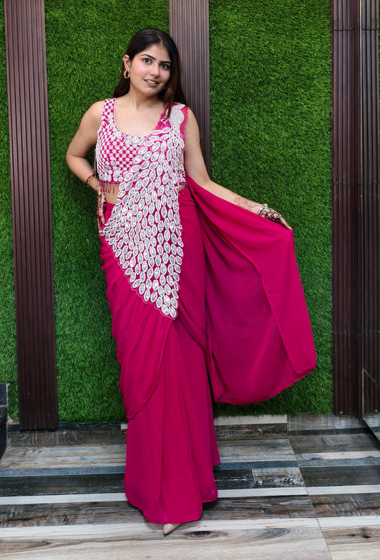 Peacock Design Embroidery Ready-To-Wear Embellished Drape Saree in Georgette