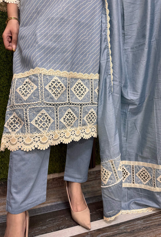 Summer Breeze Pakistani Cotton Dobby Suit With Crochet Detailing & Dupatta
