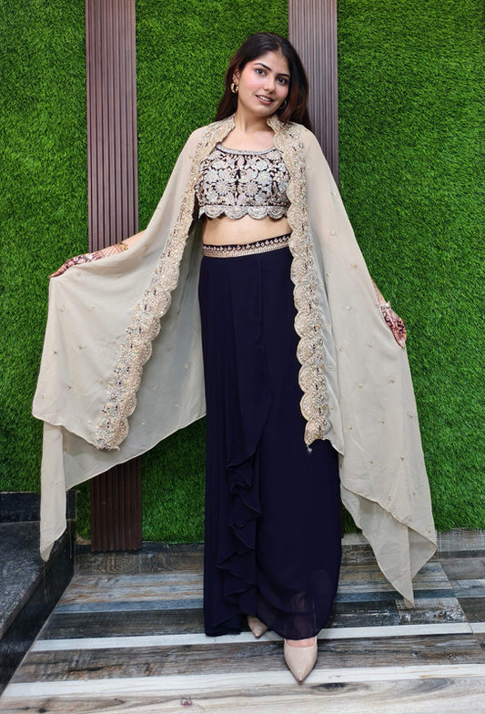 3 piece Indo Western Georgette Dress With Separate Cape Shug In Contrast with Tulip Skirt in Purple