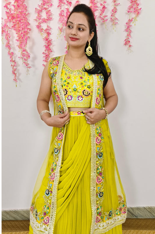 Indo Western Dress With Separate Net Embroidered Overshrug in Neon Yellow