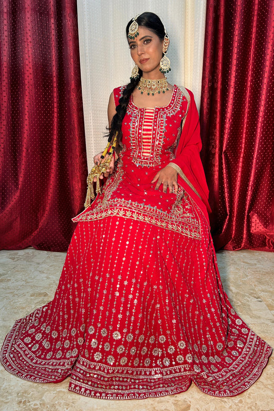 Indo Western dress in Hand Embroidered Straight Shirt With Zari Embroidered Lehenga In Red