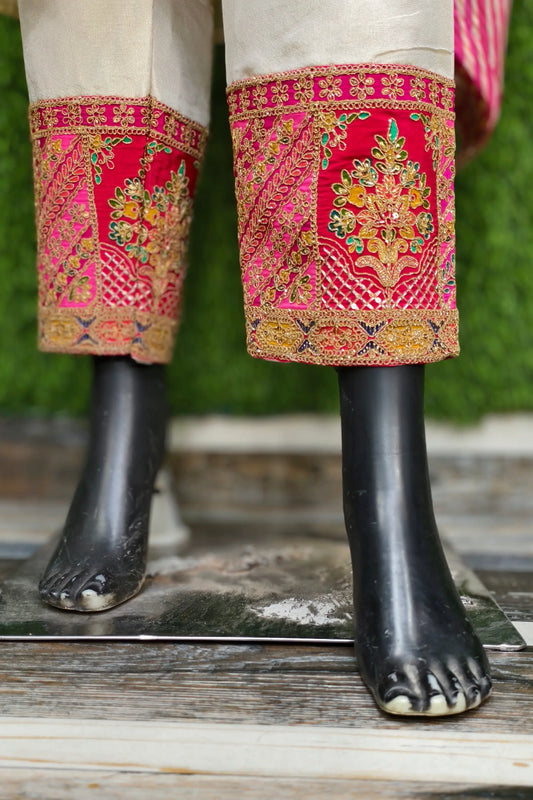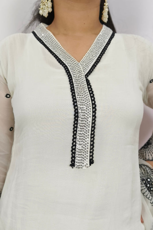 Pure Organza contrast Embroidered V neck designer Suit Set In Off whte