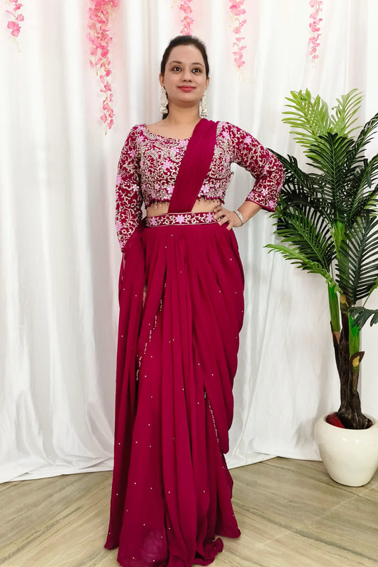 Ready To Wear Drape Dress In Georgette with Full Sleeve Embroidered Blouse in Hot Pink