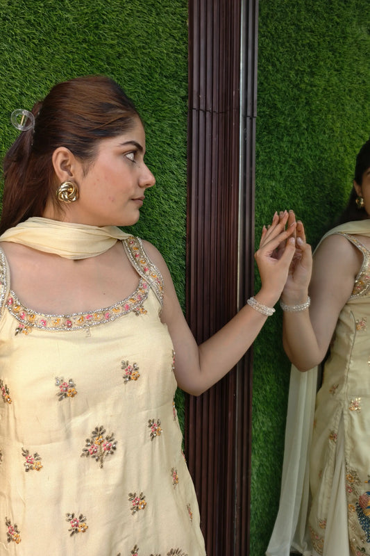 Pure Chinnon Silk Embroidered Sharara Suit In Light Gold