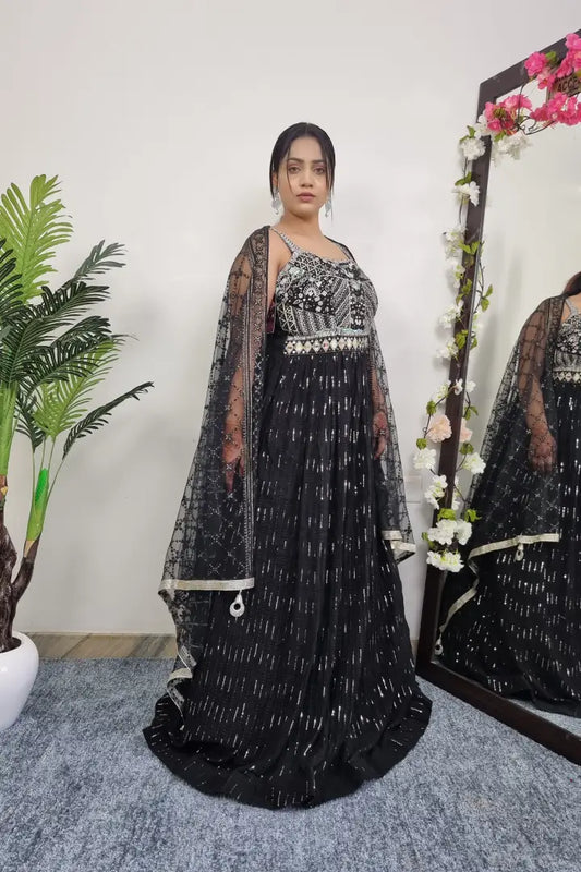 Spagheti Style Mirror Work Anarkali With Embroidered Duppatta In Black