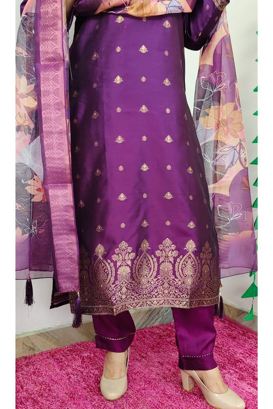 Silk Banarasi Suit With Printed Organza Duppatta In Purple
