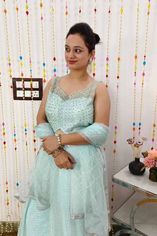 Sequence Work Stylish Anarkali Dress With Embellished Hand Work Yoke In Sky Blue