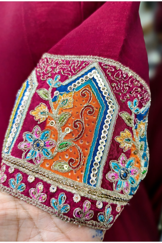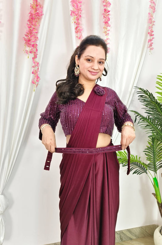 Sequenced Full Sleeve Blouse Readymade Saree With Lycra Drape and Belt in Wine
