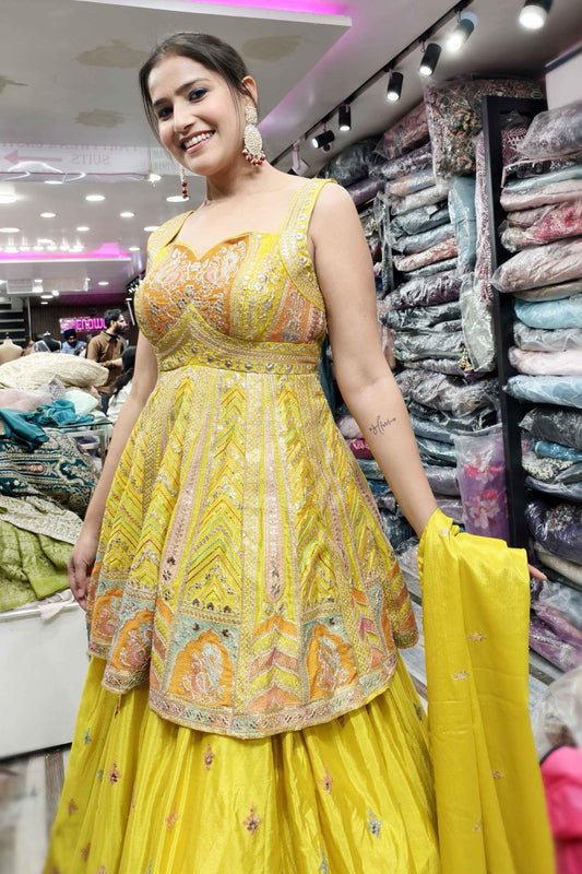 Silk Embroidered Peplum Shirt With embroidered Lehenga with Silk Bordered Duppatta