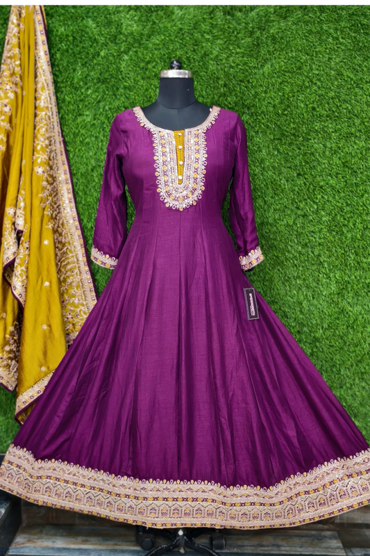 Silk Multi Embroidered Flared Anarkali Gown With Duppatta