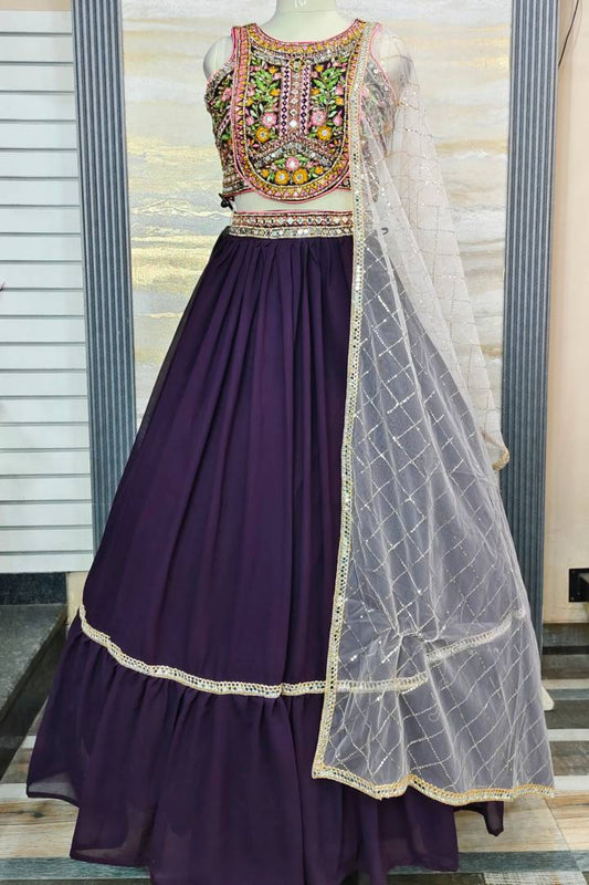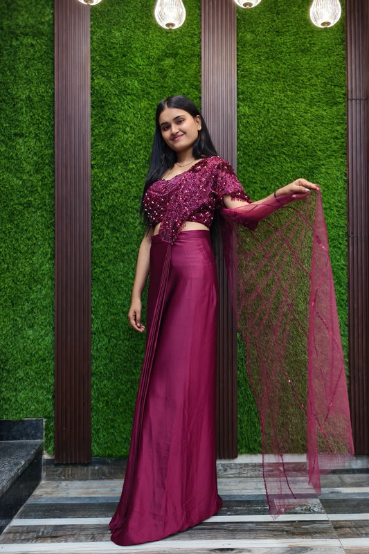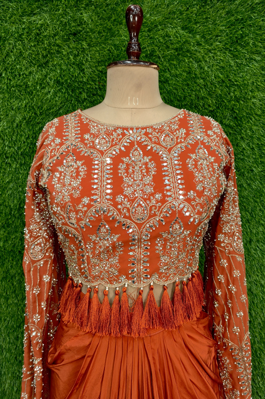 Designer Embellished Blouse Fish Cut Crop Top Skirt With Pleated Bottom