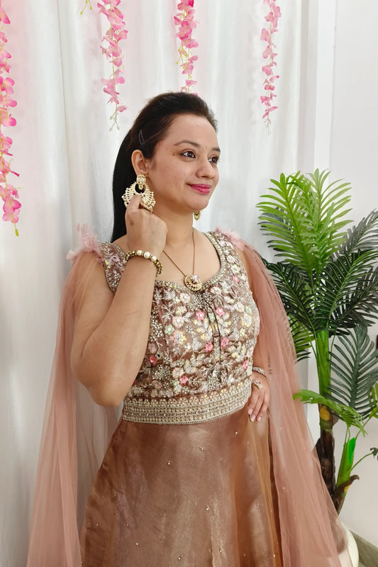 Designer Feather Sleeves Partywear Organza Gown In Mettalic Brown Colour