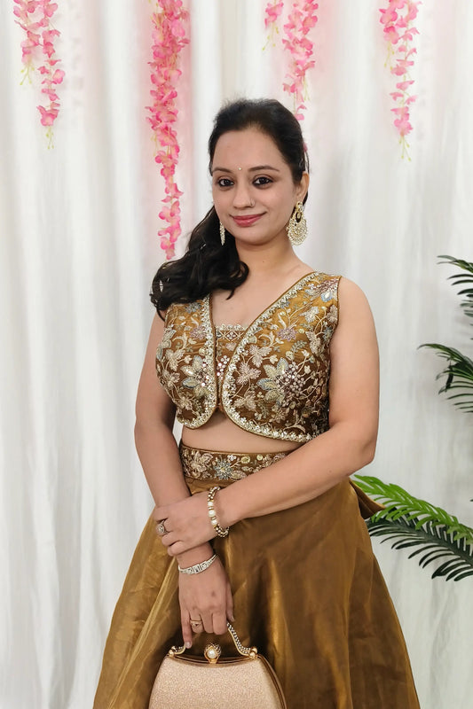 Designer Embroidered Apple Cut Choli With Organza Flared Lehenga Set In Organza With Net Bordered Duppatta in Golden Colour