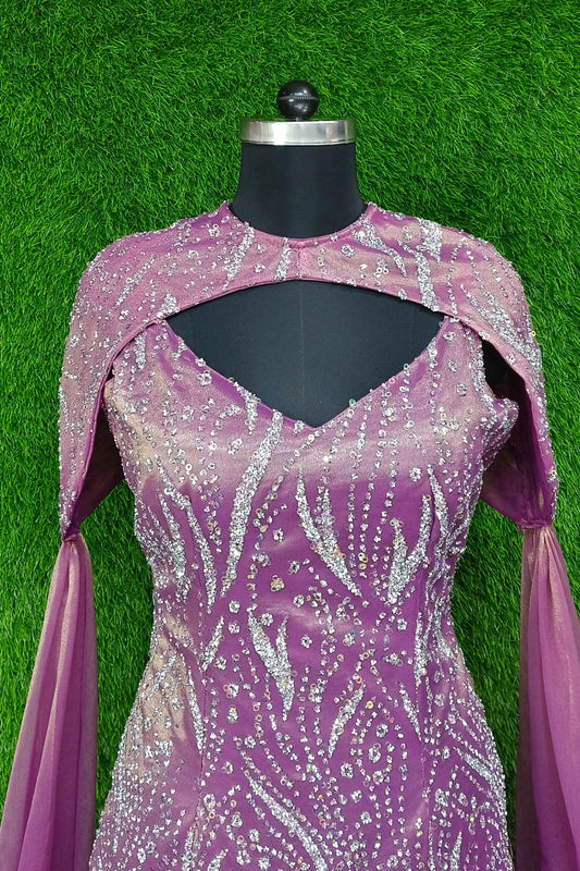 Designer Cape Style Long Sleeves Embellished One Piece Fish Cut Organza Dress In Ruffles Bottom
