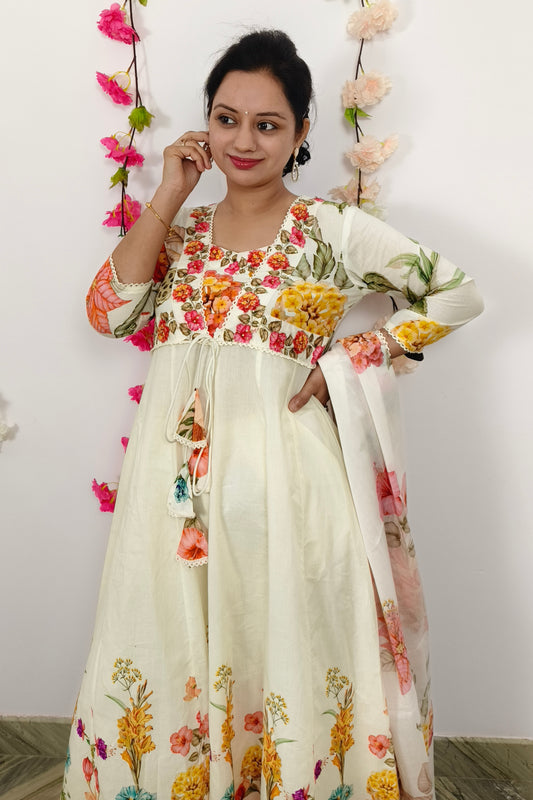 Digital Printed Anarkali Cotton Kurta Set With Crochet Lace Work in Off white