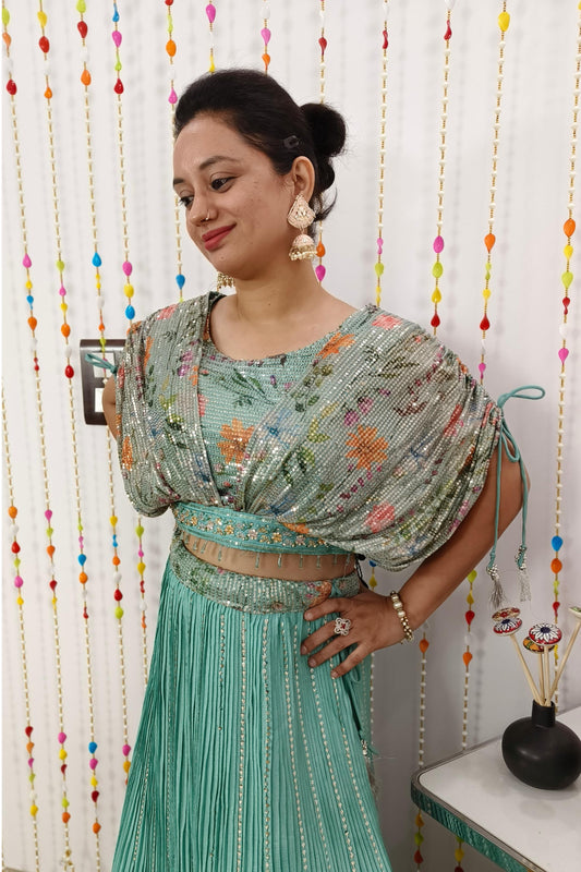 Drop Shoulder Cape Style Sequence Work Crop Top Skirt In Chinnon