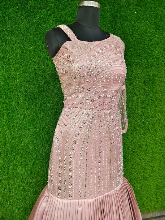 Designer Side Sleeve One Piece Hand Work Fish Cut Organza Dress In Light Pink