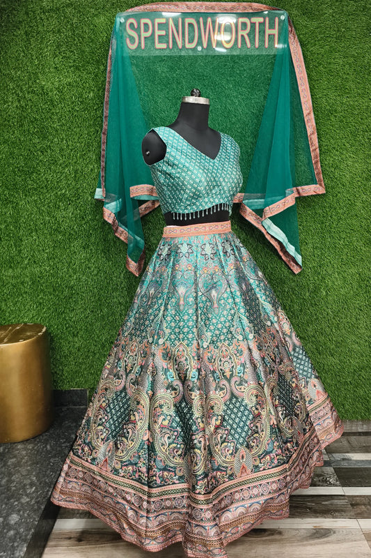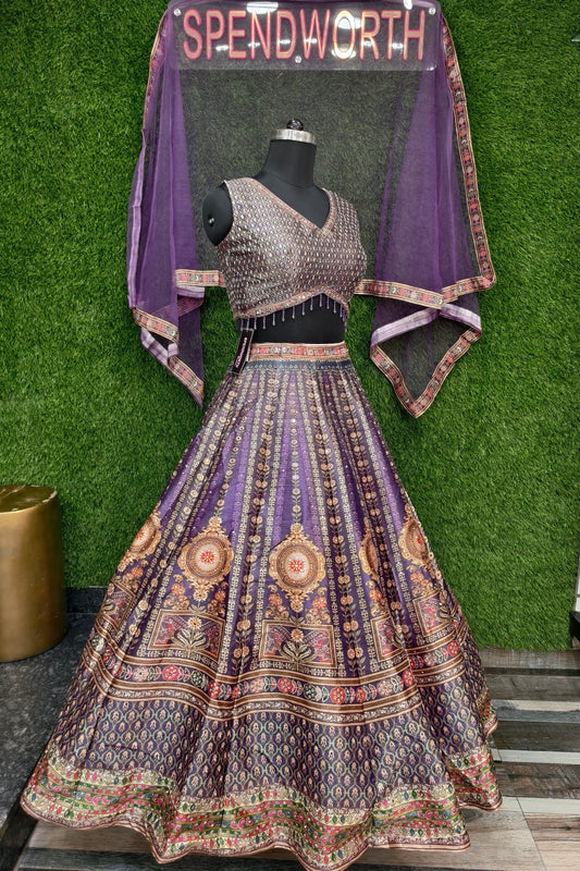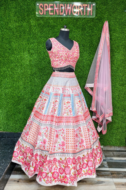 Digital Printed Silk Anarkali Lehenga In Contrast Pink
