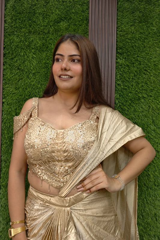 Designer Ruffle Dress In Golden With Spaghetti Hand Work Blouse