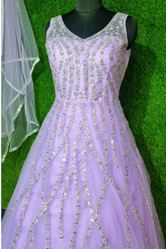 Full Embroidered Partywear Gown With Front And Back Work In Lavender