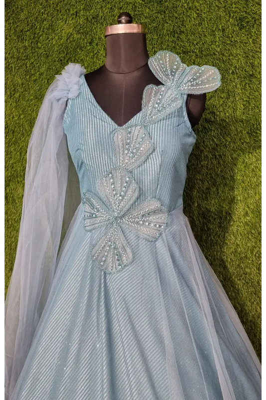 One Side Sleeve Designer Barbie Style Gown With Flower Applique Work in Blue