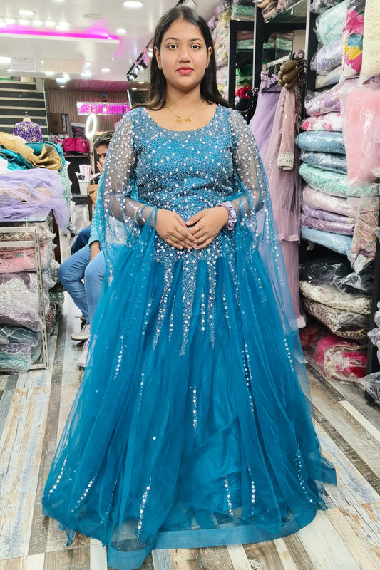 Designer Barbie Style Shimmer Fabric Gown With Yoke Designing in Blue