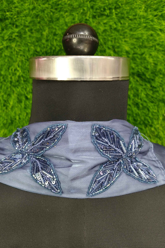 Designer Hand Work Choli With Satin Pleated Flared Skirt With Embroidered net One Side Cape Style Neck Choker Duppatta