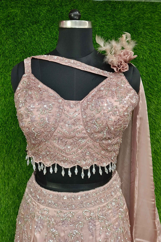 PDP Style Heavy Mirror Embroidered Spaghetti Style Silk Lehenga Choli In Mauve