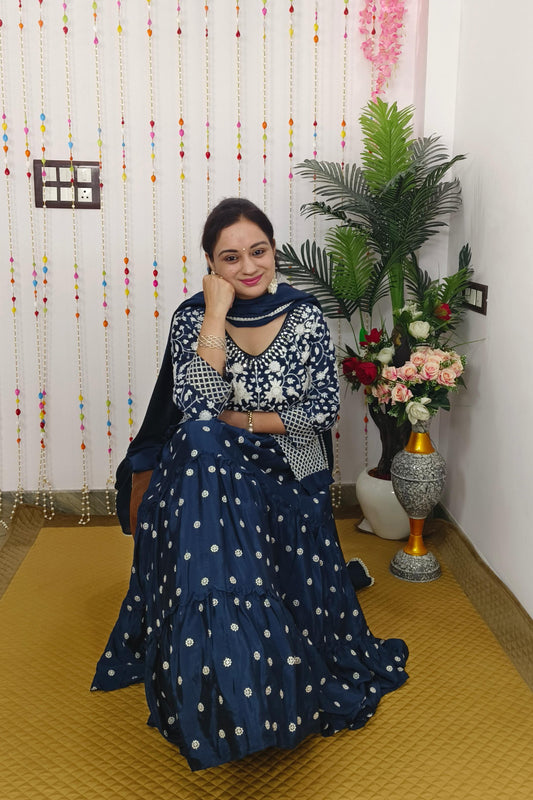 Beautiful Chinnon Silk Threadwork Embroidered Anarkali Lehenga WIth Embroidered Duppatta