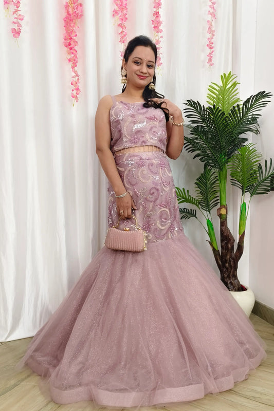 Beautiful Fish Cut Lehenga Dress With Pearl Necklace Designing In Pink Pastel Shade