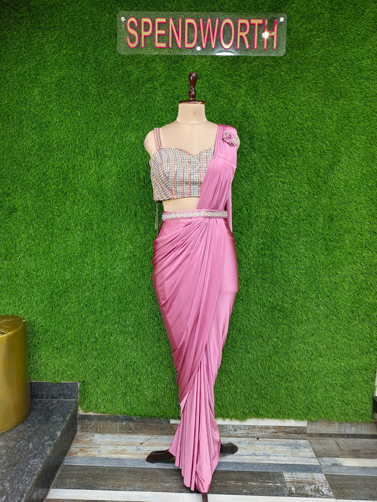Hand Work Designer Blouse Ready to Wear Drape Saree In Imported Shimmer Fabric With Waist Belt Embroidery