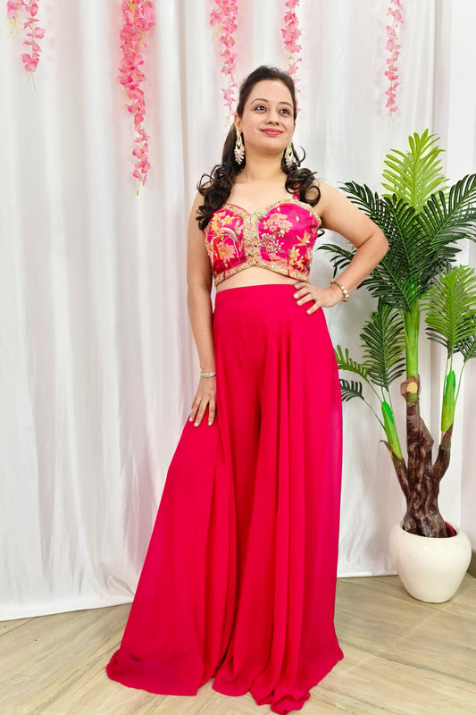 Beautiful Hot Pink Indo Western Crop Top Divider Dress With Printed cape In Silk