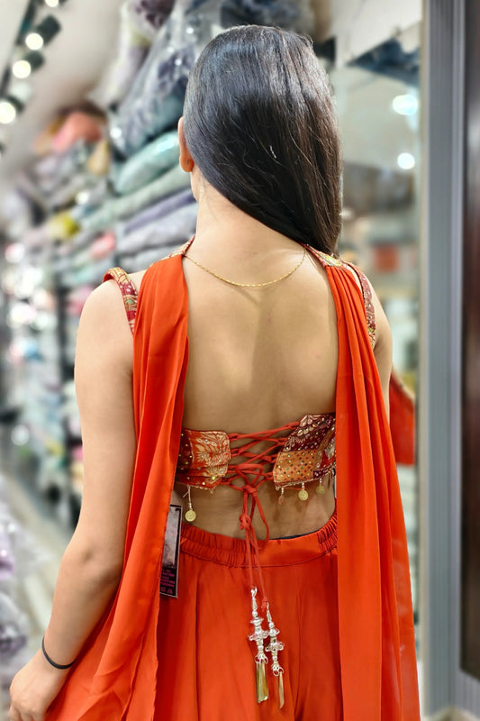 Indo Western Three Piece Dress With Shrug In Rust Orange For Haldi Occasion