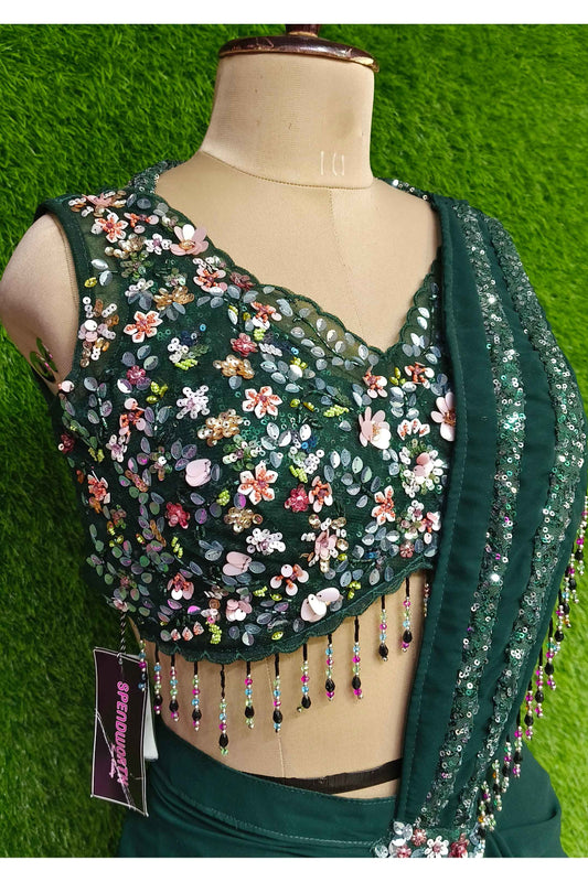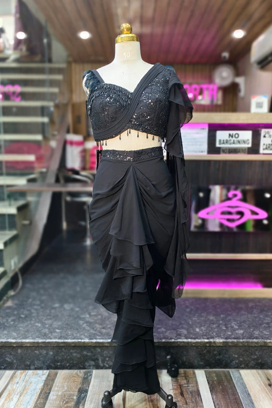 Beautiful Halter Neck Hand Embroidered Top Ready To wear Drape Dress In Georgette With Sequence Work