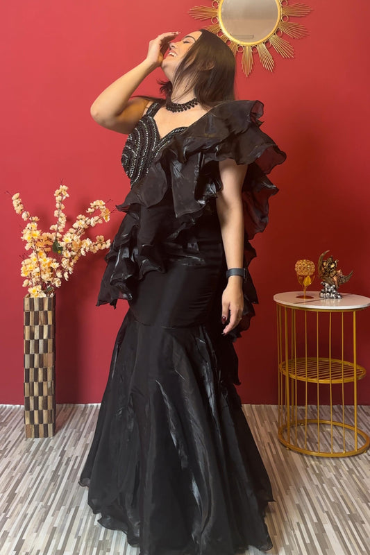 Beautiful FishCut Organza Dress In Black With Embellished Blouse