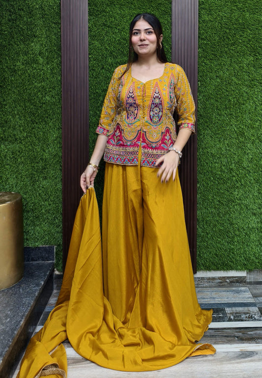 3 Piece Indo Western Printed Chinnon Silk Dress with Separate Cape Shrug for Mehendi