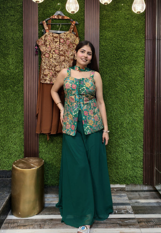 Embroidered Co-ord Set with Full Flare Divider Bottom and Printed Short Shirt in Chinnon Silk