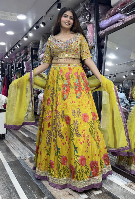 Embellished Choli with Printed Lehenga in Organza Silk for Haldi And Mehendi