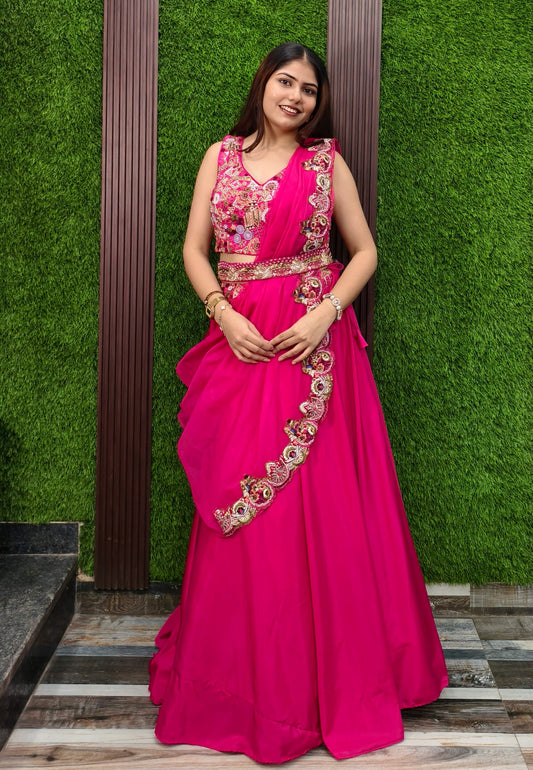 Halter Neck Designer Indo Western Dress with Cowl Skirt - Armani Satin Hand Work