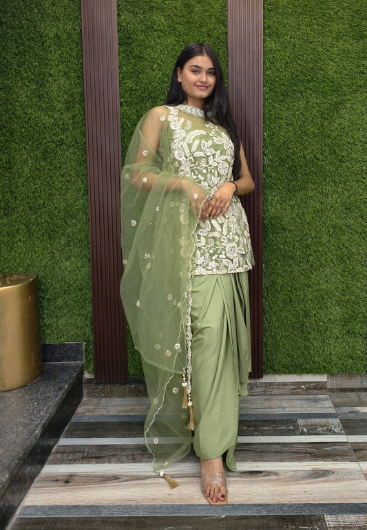 3 Piece Indo Western Armani Satin Dress with Short Embroidered Cape, Crop Top and Tulip Skirt