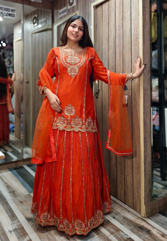 Chinnon Silk Hand Embroidered Indo Western Lehenga with Long Shirt in Orange