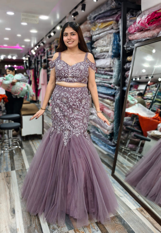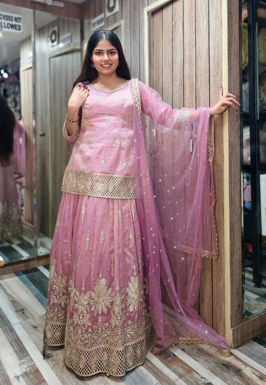 Girlish Embellished Blouse with Drape Style Organza Lehenga Dress in Mauve