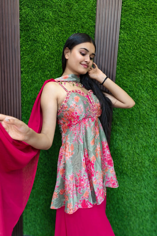 Spaghetti Styled Printed Girlish Sharara Suit In Contrast