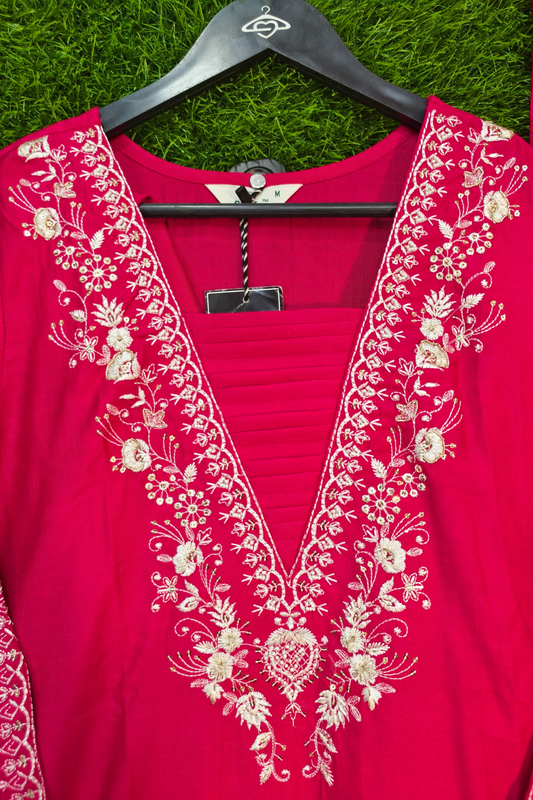 Straight Silk Embroidered V-neck design Pakistani suit with pants and dupatta