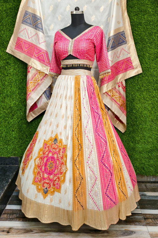 Box Pleated Crop Top Skirt with Hand Work Blouse