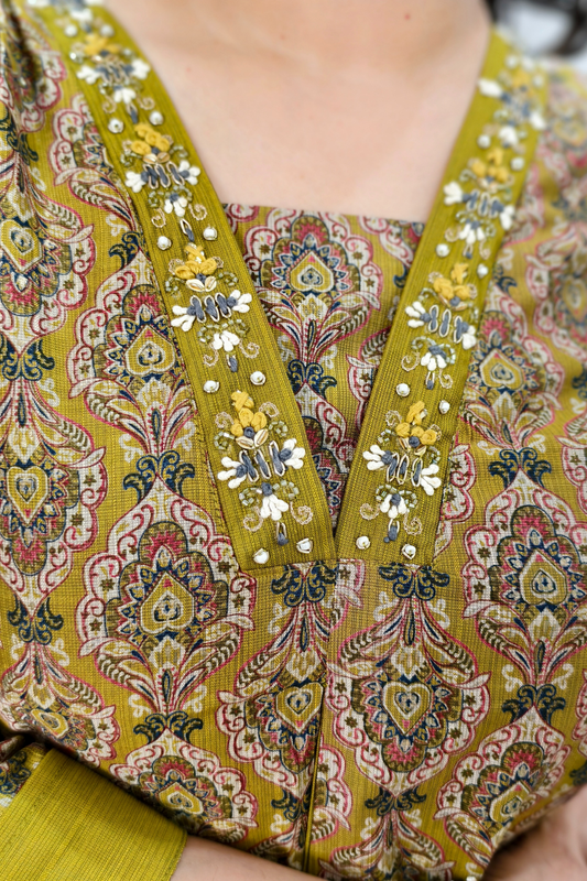 Stylish Silk Printed Aline Kurta Set in Mehndi Colour