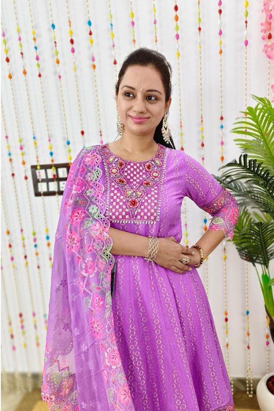 Wow Anarkali Embroidered Suit Set In Cotton Dobby With Beautiful Organza Embroidered Duppatta In Purple