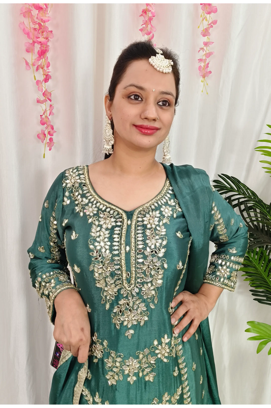 Straight Shirt Heavy Mirror Work Chinnon Silk Sharara Suit With Duppatta In Mat Green