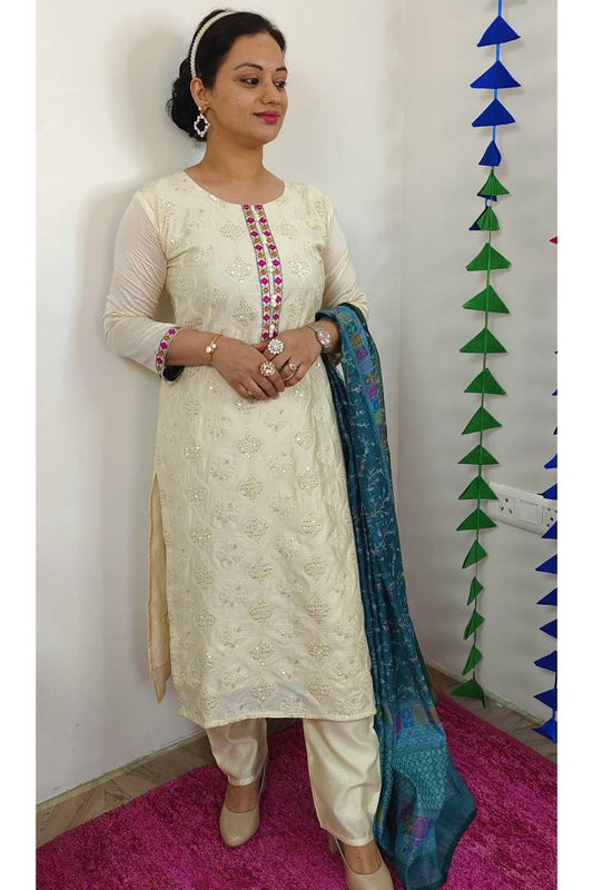 Designer Kurta Set With Printed Duppatta in White