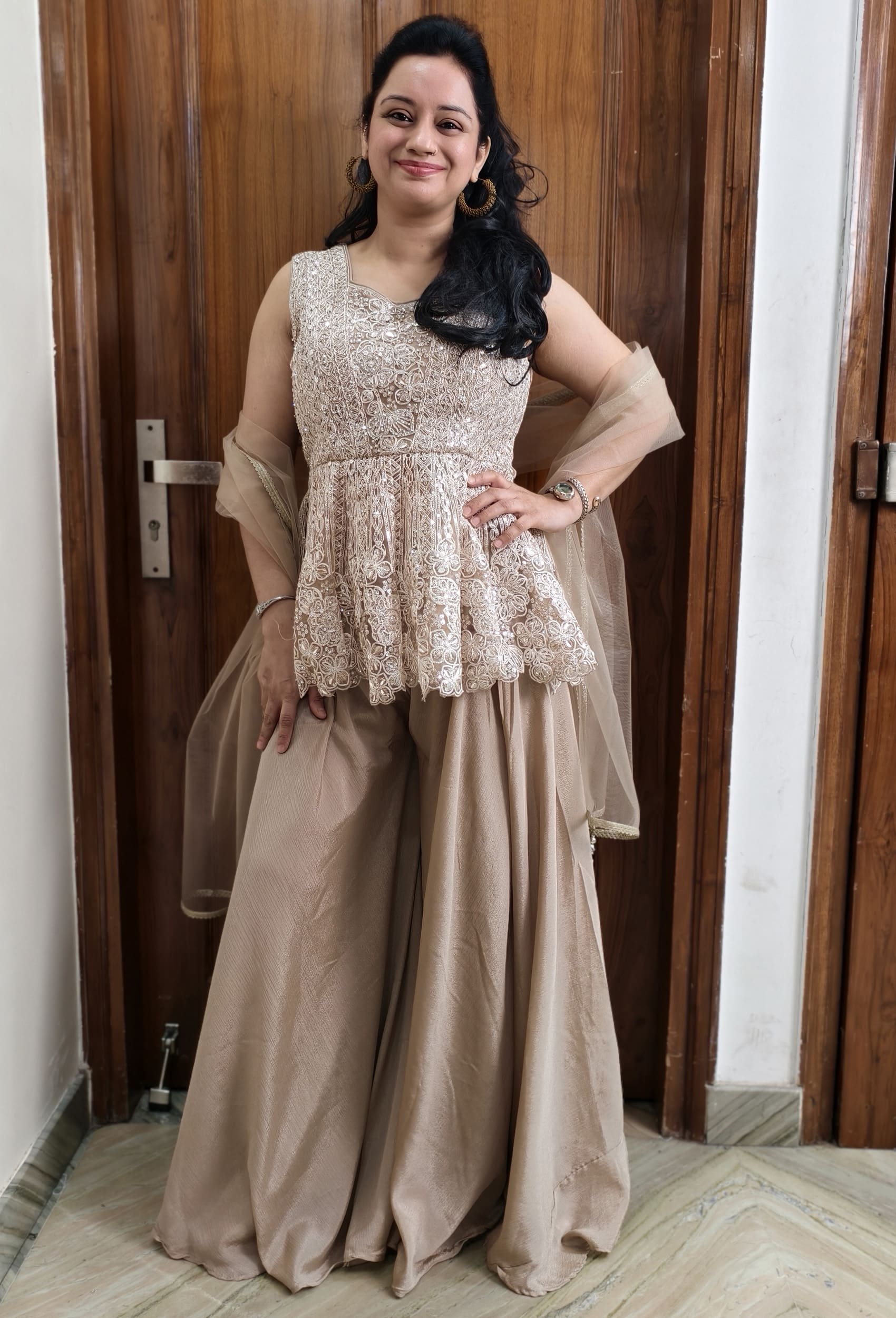 Circular Peplum Net Top and Chinnon Silk Plazo Cord Set